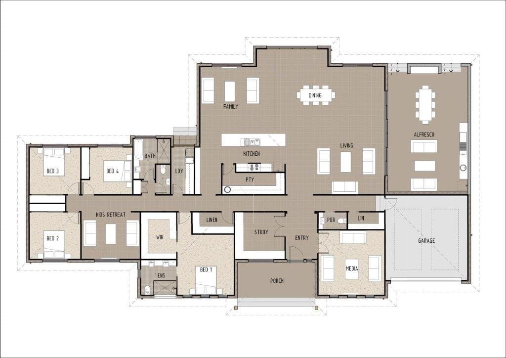 This large modern home is designed with family living in mind. With a huge and welcoming porch, there is a dedicated study and a fully enclosed media room to your right.