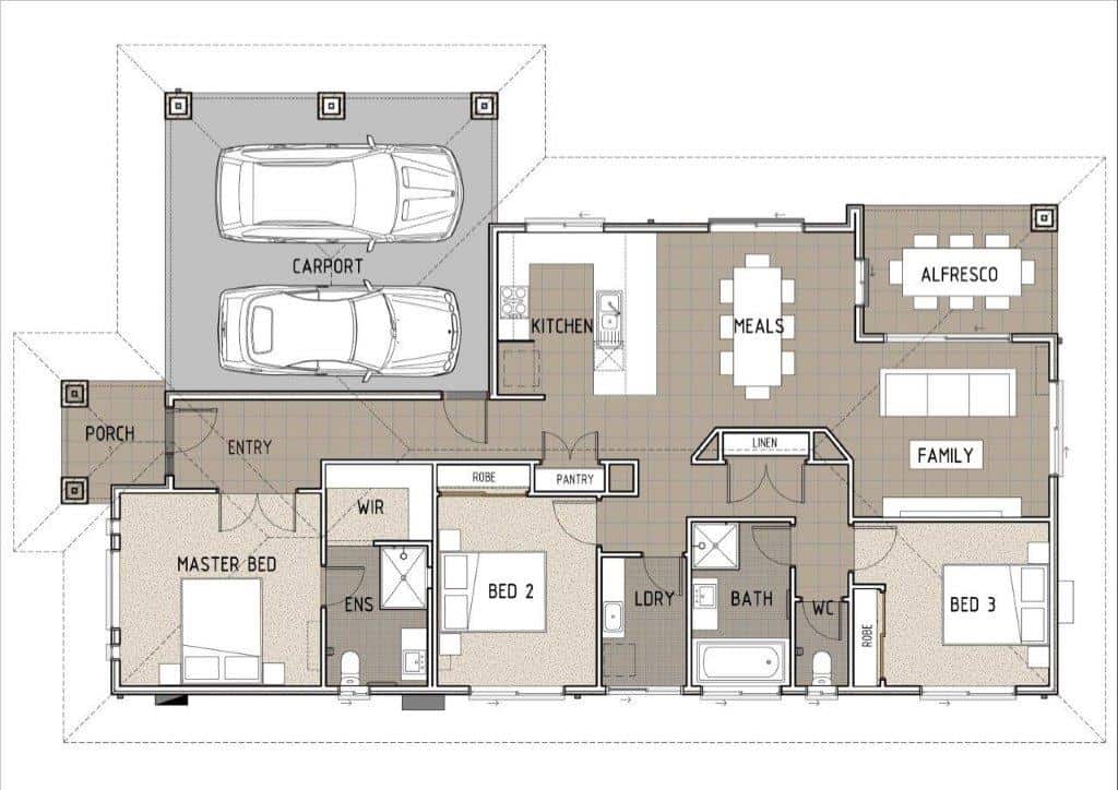 This simple three bedroom floor plan design is ideal for low budgets and small families. The master bedroom is at the front of the home and features a walk in wardrobe and private ensuite. Further into the home there are two more bedrooms (both with build in wardrobes) separated by the family bathroom and separate laundry. The traditional shaped kitchen flows into the open dining room which then flows into the outdoor alfresco. A separate family room can be found at the rear of the home and also has access to the alfresco.